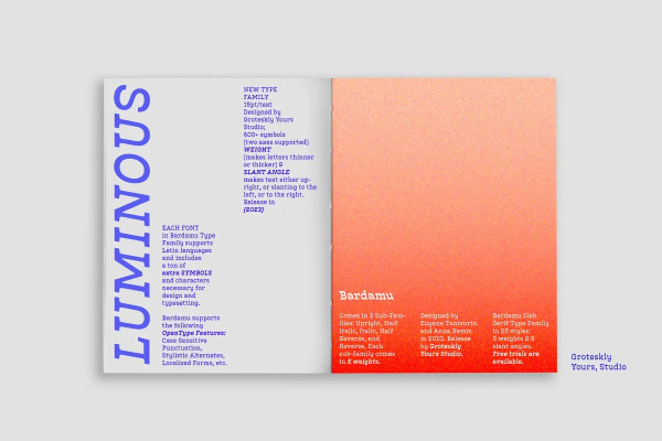 Bardamu type family includes 25 static styles as well as a variable font. All styles can be purchased separately or as a full family package. Two styles can be downloaded free of charge. If you’d like to explore Bardamufurther, we also offer free trials upon request. Feel free to reach out to us.