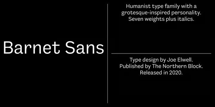Barnet Sans Font is a humanist typeface with a grotesque-inspired personality. Lively stroke-endings of several characters give this design its distinctive style, as well as a friendly and approachable presence. Created for use in both print and screen settings, Barnet Sans delivers a hint of flavour in large sizes, while being subdued enough to work in smaller text-driven settings.