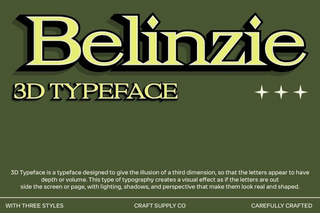 Belinzie 3D Font is a modern serif font that exudes sophistication with its wide letterforms, offering a sense of stability and luxury. The generous space within each character adds grace and refinement, making it ideal for designs that require a professional and elegant appearance.