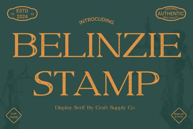 Belinzie Stamp Font: Adding Depth to Display Typography. Stamp-Inspired Serif Design Belinzie Stamp features a serif display font characterized by its distinctive stamp effect. Each letter is imbued with a sense of authenticity, reminiscent of vintage postal markings.