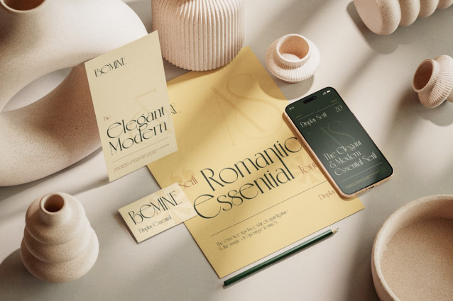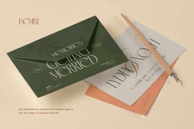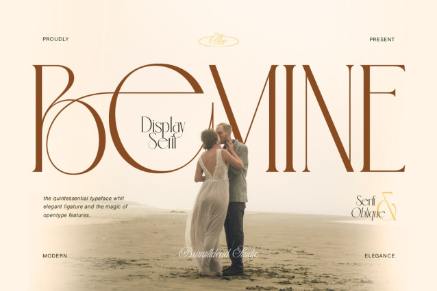 Bemine Font, a display serif font with a unique and eye-catching look—perfect for designs that want to appear classy and romantic. This font features strong contrast between thick vertical strokes and thin horizontal lines, creating a glamorous, luxurious, and high-fashion feel. It’s perfect for wedding invitations, fashion branding, book covers, headlines, editorials, magazines, and any design project that needs a graceful with a strong presence look.