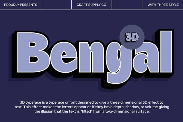 Ideal for Striking Posters and Unique Branding Bengal 3D is ideally suited for a wide range of applications that demand a strong visual presence. From posters and logos to promotional materials, this font’s bold, retro look combined with its 3D depth makes it a versatile choice for projects aiming to deliver a memorable, eye-catching aesthetic. Its unique blend of retro style and modern dimensionality makes Bengal 3D an excellent choice for adding a distinctive, creative flair to any design.