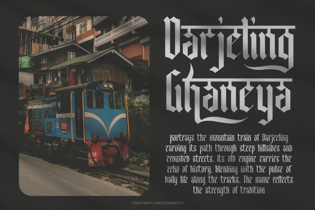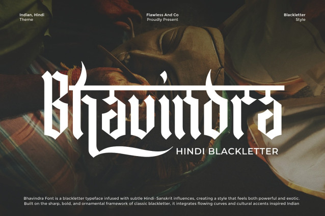 Bhavindra Blackletter Font is a Hindi-inspired blackletter font that merges the bold, ornamental framework of traditional blackletter with the cultural richness of Indian aesthetics. Infused with subtle Hindi–Sanskrit influences, it creates a style that is both powerful and exotic—perfect for projects that demand authority, mystique, and cultural depth. With its sharp edges, flowing curves, and distinctive accents, Bhavindra balances strength and elegance while maintaining high readability. This makes it an excellent choice for impactful branding, editorial headlines, poster designs, and cultural-themed projects that need a unique typographic voice.