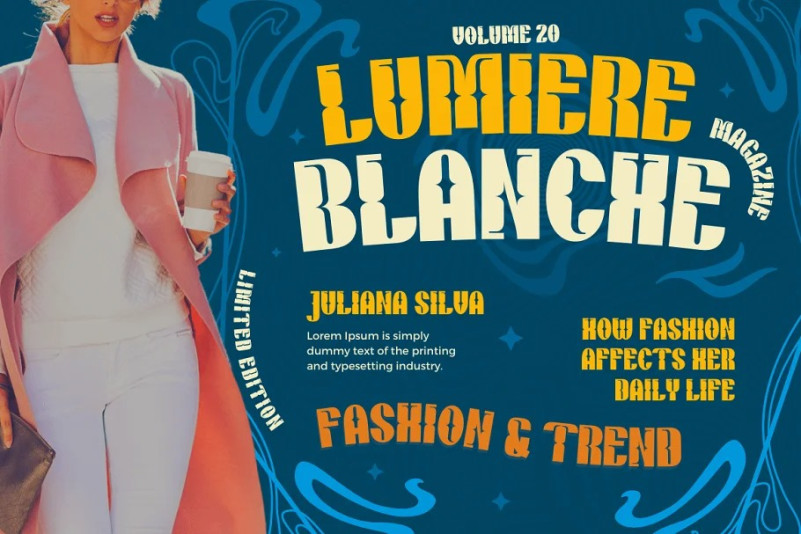 The design trends of the 1970s inspired this Bhikum display font. It has a groovy, classic, and fun feel, but also has aesthetic value for its unique and memorable design. Use this font to add some cool style to your designs!