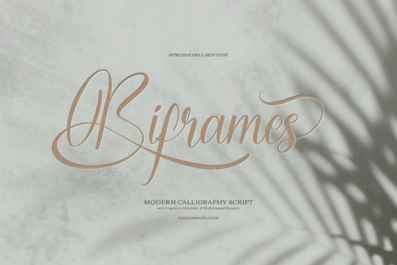 Biframes Script Font a Modern Calligraphy Script typeface that exudes grace and sophistication.This elegant font is characterized by its fine, high-contrast strokes and exaggerated, beautiful ligatures and alternates, giving the impression of true expert penmanship.