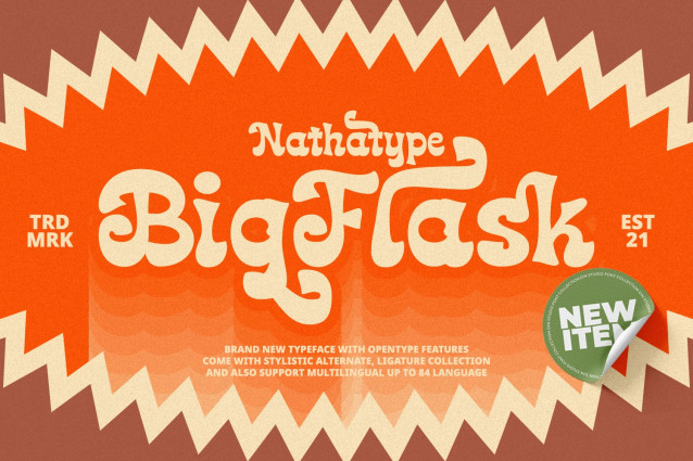 Big Flask Font is a typeface that will make your projects elevate. An excellent choice to add the right amount of retro touch. This typeface with artistic style looks very interesting for loads of different projects and promotions. Use it to create standout headings, logo, book cover, poster, t-shirt, branding, and advertisement needs.