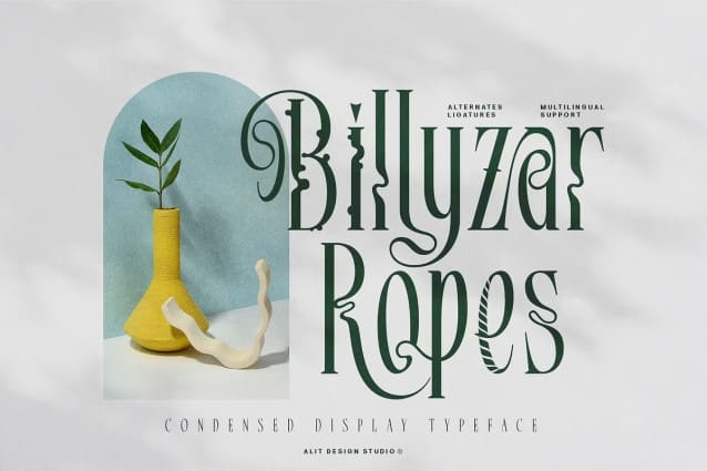 Whether you’re crafting a bold headline, designing a logo, or adding a creative touch to your editorial content, Billyzar Ropes Typeface offers the flexibility and uniqueness you need. Elevate your typography game with this captivating and stylish serif font.
