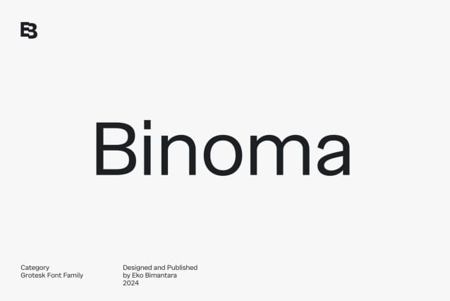 Binoma Font – the font is considered a formidable grotesk font family. Designed in 2024 by Eko Bimantara, Binoma stands out for its sans-serif style that exudes modernity and versatility. Despite its neutral base, Binoma boasts a sophisticated personality that adds character to any design it graces. Ideal for countless applications, Binoma finds its place in display settings, large headers and various layout designs. Its adaptability extends to logos, websites, brand identities, product packaging, and even text, making it a valuable asset for web fonts and graphic design projects. wide. Binoma is the perfect choice to make a bold statement, seamlessly integrating into creative endeavors, ensuring a harmonious combination of modernity and versatility.