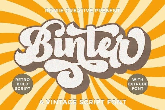 Binter Script Font A bold retro script that will take you back to the 60s. This typeface has an extrude version so you can create a retro effect font easily. This font is very suitable for the application, especially on logos, and various other formal forms such as invitations, labels, logos, magazines, books, greeting/wedding cards, packaging, fashion, makeup, stationery, novels, labels, or all kinds of things. advertising purposes.