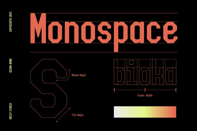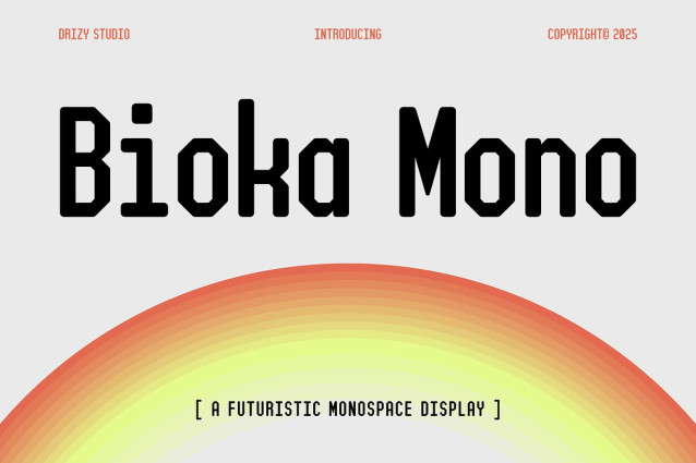 Bioka Mono Font – Futuristic Monospace Display Font is a cutting edge, futuristic monospace display font that seamlessly blends the precision of monospace forms with the sleek, minimalist aesthetic of modern design. As a member of the Geometric Monospace category, Bioka Mono exudes a sense of balance and clarity, making it ideal for coding environments, technical documentation, and digital products that demand both legibility and style. The font’s sharp angles and smooth curves evoke a sense of forward thinking, futuristic design while maintaining an easy to read structure, making it both practical and visually appealing. Whether you’re designing a user interface, creating a sci-fi inspired visual, or developing cutting edge software, Bioka Mono provides a unique typographic experience that feels both modern and timeless. Its geometric nature gives it a strong, robust presence, while its monospace format ensures that every character occupies the same width, making it perfect for precise alignment in programming and technical layouts. Embrace the future of typography with Bioka Mono, where technology meets artistry in every character.
