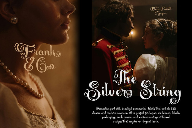 Black Forrest Font, a decorative font that showcases exquisite ornamental details, blending classic and 1900s influences with old fancy lettering and vintage script. This font is ideal for a variety of display purposes in your product design, especially if you seek a vintage and classic aesthetic that exudes elegance and luxury. Perfect for applications such as book covers, product labels, logo badges, drink bottles, tattoo shops, coffee shops, branding products, wedding invitations, and more.
