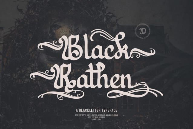 Black Rathen Font | Blackletter Typeface, from Denustudios, suitable for any projects such as: logos, branding projects, homeware designs, product packaging, mugs, quotes, posters, shopping bags, t-shirts, book covers, name card, invitation cards, greeting cards, label, photography, watermark, special events, and all your other lovely projects that need a Blackletter Typeface taste.