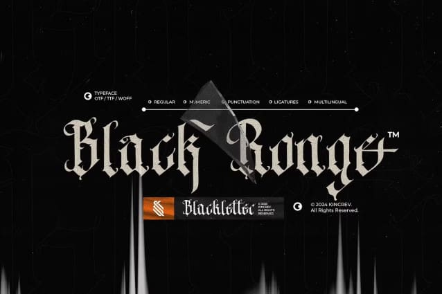 This font is made for personal use. Get the full version of the fonts if you want to use it for commercial purposes by purchasing the licenses here: https://creativemarket.com/KincrevStudio/92459024-Black-Ronge-Blackletter-Font?u=fontlot123