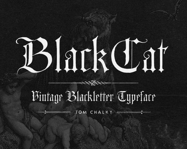 Blackcat Blackletter Font, an authentically Vintage Blackletter Font. Its design is based on a specimen from the 1800s that oozed that classic Blackletter style that is (I’m glad to see) making a glorious comeback!