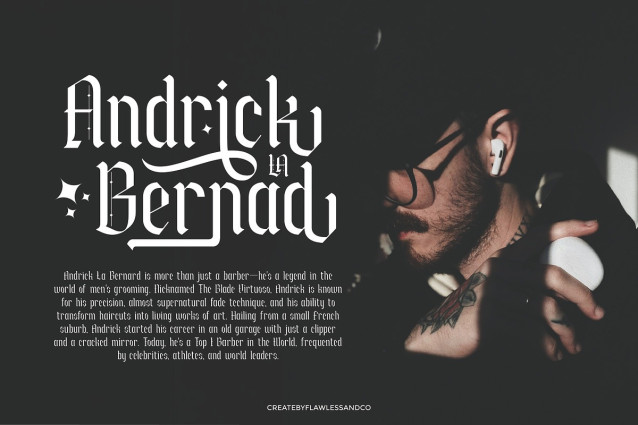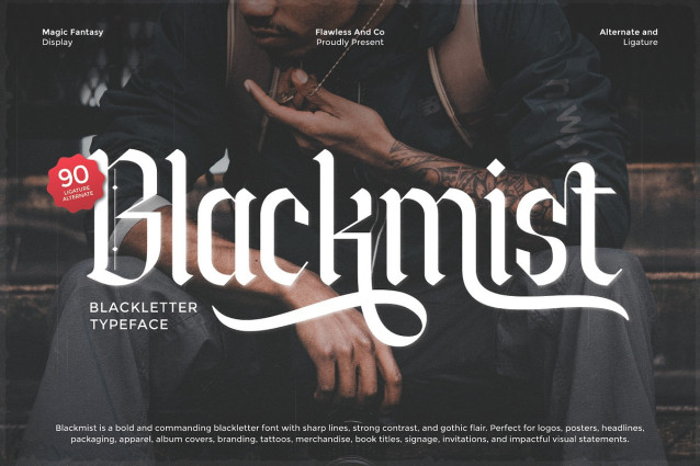 Blackmist Blackletter Font is a bold and captivating blackletter typeface that combines sharp edges, strong contrasts, and a gothic-inspired aesthetic. With its commanding presence and intricate details, Blackmist is perfect for creating impactful visual designs that demand attention. Ideal for logos, branding, posters, headlines, apparel, album covers, packaging, merchandise, tattoos, book titles, invitations, signage, and statement designs, this typeface brings both elegance and power to any project. With its distinctive blackletter style, Blackmist is a must-have font for designers who want to infuse their work with boldness, sophistication, and timeless gothic flair.
