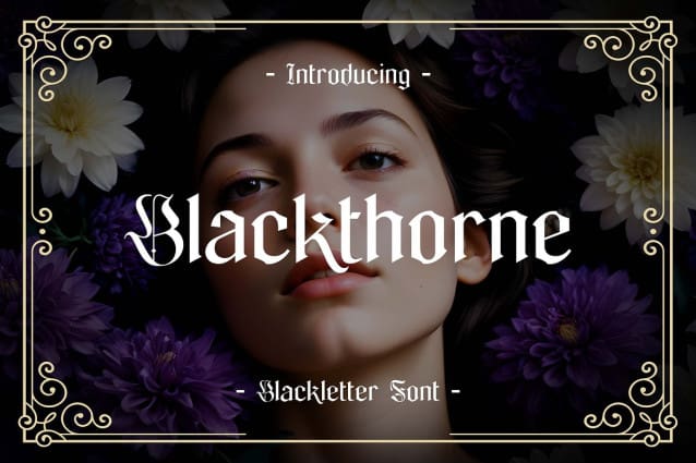 Blackthorne Blackletter Font. The modern display font feels beautiful classy, elegant, and stylish. This font is ideally suited for a wide variety of projects, such as signature, stationery, logo, wedding, typography quotes, magazine or book covers, website headers, branding, and more. Also, fashion-related branding or editorial design displays both masculine and feminine qualities.
