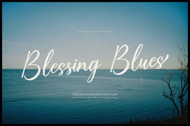 Blessing Blues Font – Vintage Handwritten, from Gracetypestudio, suitable for any projects such as: logos, branding projects, homeware designs, product packaging, mugs, quotes, posters, shopping bags, t-shirts, book covers, name card, invitation cards, greeting cards, label, photography, watermark, special events, and all your other lovely projects that need a Vintage taste.