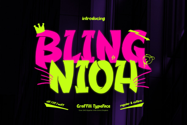 Bling Nioh | Graffiti Typeface, from Gracetypestudio, suitable for any projects such as: logos, branding projects, homeware designs, product packaging, mugs, quotes, posters, shopping bags, t-shirts, book covers, name card, invitation cards, greeting cards, label, photography, watermark, special events, and all your other lovely projects that need a Graffiti Typeface taste.