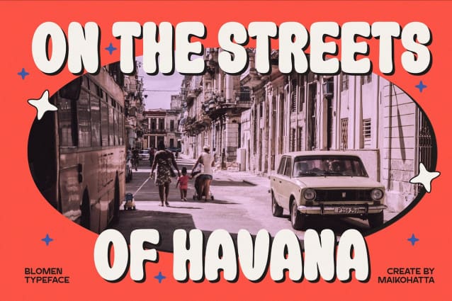 Blomen Display Font – Bubble Retro Display. This font has round and wide letter shapes with curved corners, giving a soft and friendly impression. Because of this, this font is often chosen for designs aimed at children or those with a playful nature, as it conveys a more youthful and cheerful feel.