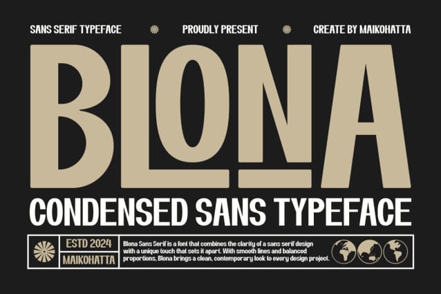 Blona Font – Condensed Sans Typeface. This font is a type of font that is characterized by narrower or slimmer letterforms compared to regular or wide fonts. Condensed fonts are often used in various graphic designs, print materials, and other media because they have distinct advantages and unique characteristics