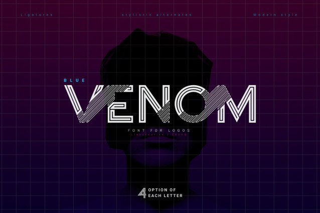 Blue Venom Font is a unique typography with a modern style, Each letter is cut into two parts, the first consists of three labyrinthine combined lines and the other is a diagonal cut line, so that the combination of these two parts into one letter that looks stunning , and each letter consists of four character choices, two character choices for numbers, and equipped with Ligatures (Opentype feature) All character options are included in one font. You can use alternatives in most major image editors, just find the Glyps (Alternate) menu item there. For example, in Adobe Illustrator you need to select the Window / Type / Glyphs menu item.