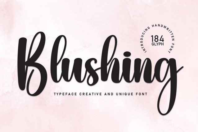 Blushing Typeface A popular and professional script font. Modern and elegant, this typeface is made of beautiful creative strokes.This font is perfect for your creative ideas, both formal and informal. It has a modern style with a touch of creative ideas that is very suitable to be applied anywhere that requires creative ideas such as invitation cards,letterheads, website logos, social media, banners, advertisements, brochures, packaging products, leather products, and any product that requires writing.