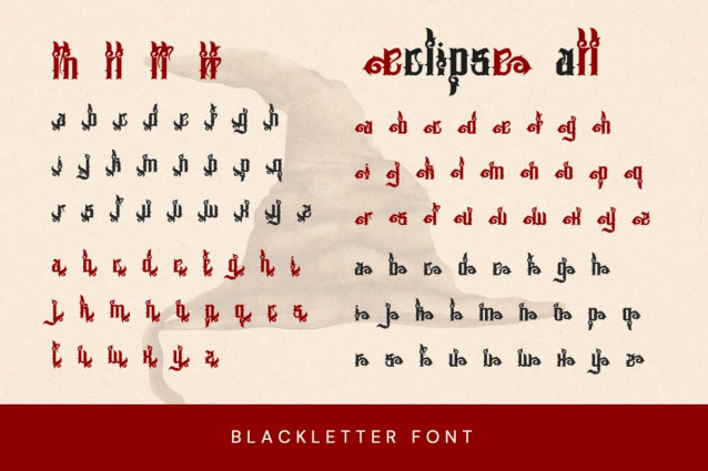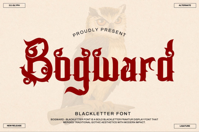 Bogward Blackletter Font is a bold blackletter fraktur display font that merges traditional Gothic aesthetics with modern impact. Its intricate letterforms feature sharp angles, dramatic strokes, and striking contrasts, embodying strength, authority, and historical charm. The bold weight enhances its commanding presence, making it ideal for designs that demand attention and sophistication.