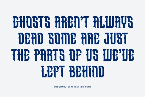 Bosghard Font, a modern blackletter typeface from the year 2025. This typeface offers a contemporary take on traditional gothic lettering, featuring bold, impactful forms and alternate characters, making it suitable for modern branding and headlines that require a touch of historical drama.