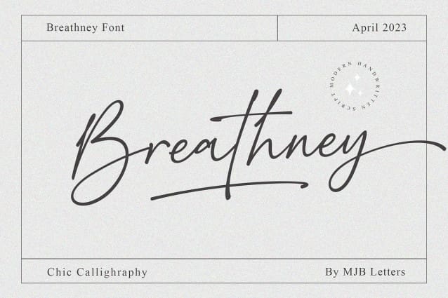 Breathney Script Font a beautiful, natural handwritten font that exudes charm. With its soft, curved lines, it captures the uniqueness of human handwriting, adding a personal touch to graphic designs. Ideal for feminine, friendly projects like wedding invites, logos, and posters, Breathney brings warmth and authenticity. Enhance your designs with its gentle, organic aesthetic, conveying a heartfelt message.