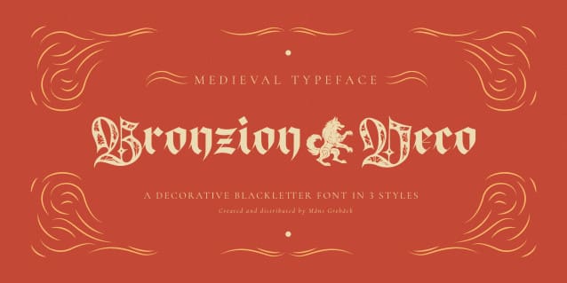 Bronzion Deco Font is an illuminated blackletter typeface rooted in medieval aesthetics. Perfectly fit for branding, logo, wedding things, greeting cards, fashion, lookbook, marketing promotion, anytime you want to look fancy elegant but still casual.