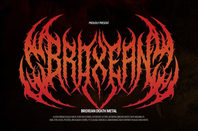 Broxean Death Metal Font, from Denustudios, suitable for any projects such as: logos, branding projects, homeware designs, product packaging, mugs, quotes, posters, shopping bags, t-shirts, book covers, name card, invitation cards, greeting cards, label, photography, watermark, special events, and all your other lovely projects that need a Death Metal taste.