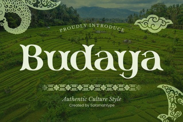Budaya Culture Font, which is a unique letter shape that gives a classic or traditional impression. This typeface incorporates visual elements, characters, or stylistic features inspired by the traditions, art, or aesthetics of a culture.