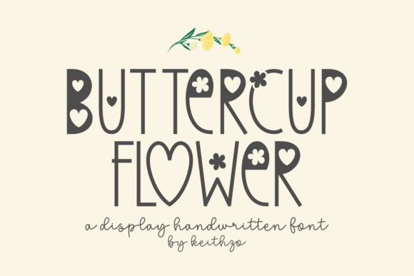 Buttercup Flower Font, a delightful and charming new font that brings a touch of warmth and whimsy to all your creative projects. This display handwritten font features a unique design where certain letterforms are replaced with playful hearts and delicate flowers, giving it an irresistibly cute and joyful personality.