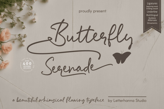 This font is used only for demos (Demo license). If you want to use this font for commercial use please contact: https://creativemarket.com/letterhanna/290966598-Butterfly-Serenade-Font