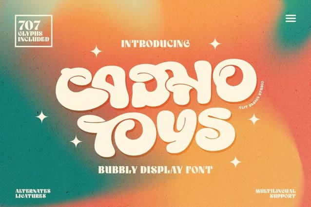 CADHO TOYS will bring joy and excitement to any project it graces. Whether you’re designing posters, logos, packaging, websites, or any other creative endeavor, this bubble display font is bound to make a lasting impression. Its alternate ligature style adds a touch of uniqueness and flair, setting your designs apart from the crowd.