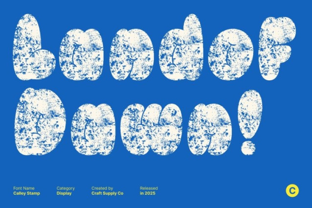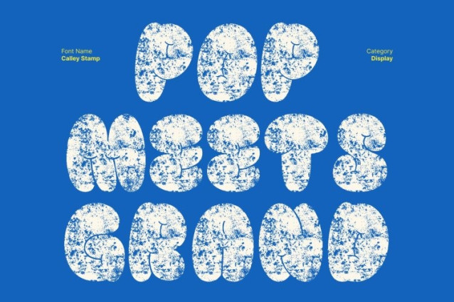 Calley Stamp Font This is a display font designed with bold, bubbly shapes that instantly deliver a funky, cute, and energetic vibe. Each character feels soft yet impactful, making your design stand out with a joyful and eye-catching presence.
