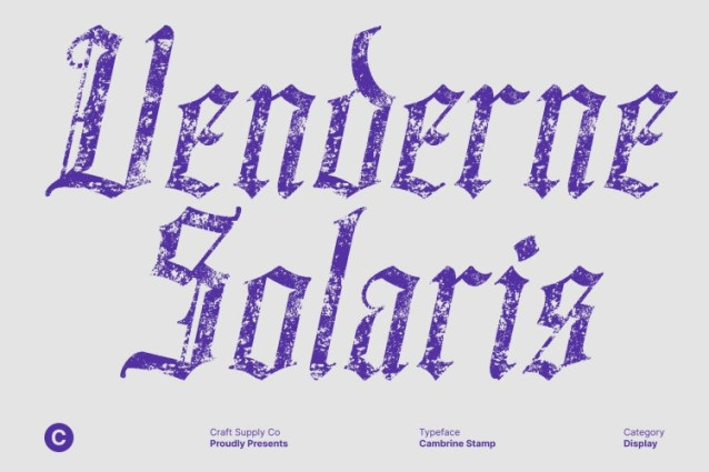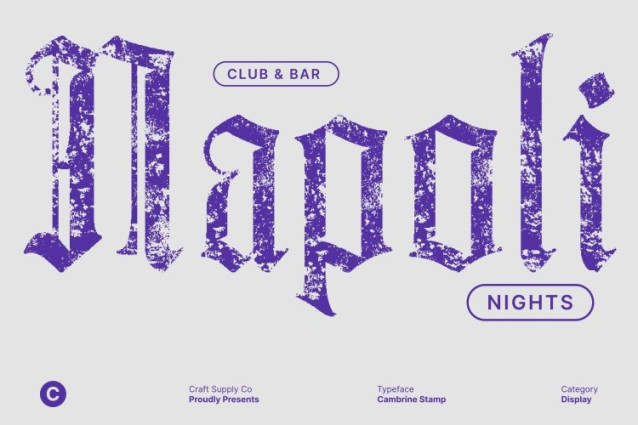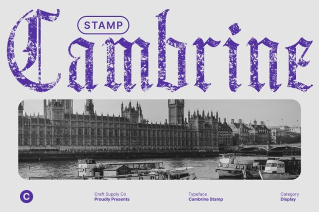 Cambrine Stamp Font A decorative Old English font crafted with rich ornamental strokes and classic medieval energy. Every letter is shaped with dramatic curves and sharp details, capturing the essence of ancient manuscripts and gothic artistry. Its distinctive character makes it instantly recognizable, perfect for designs that need historical depth and visual authority.