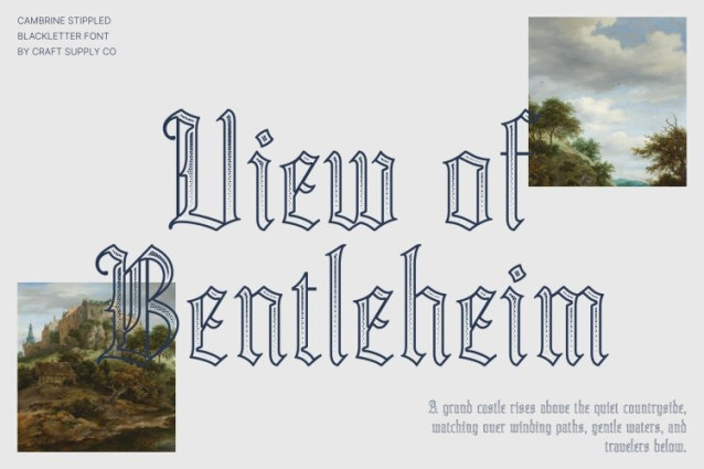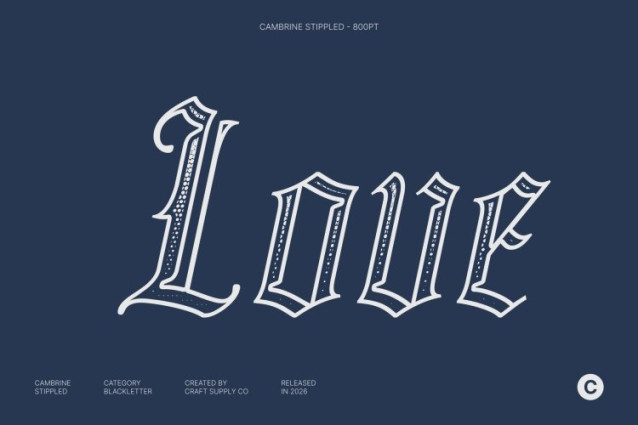 Cambrine Stippled Font This transforms the dramatic elegance of traditional Gothic typefaces into a visually captivating stippled display font. By integrating a dense dotted texture reminiscent of classical ink-dot illustrations, this font creates a rich, artistic surface that blends vintage charm with contemporary sharpness. It feels both historical and fresh perfect for designers seeking a timeless yet bold aesthetic.