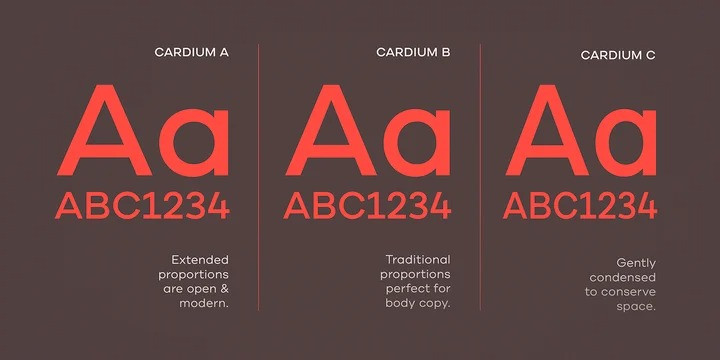 Cardium shares much of its DNA with our Draft type suite but is more utilitarian. It’s a comprehensive family with nine weights from Hairline to Black and three widths – with ‘A’ being the most extended, ‘B’ having traditional body copy proportions and ‘C’ gently condensed for times when space is at a premium. It offers a full complement of professional typographic features and extensive language support.