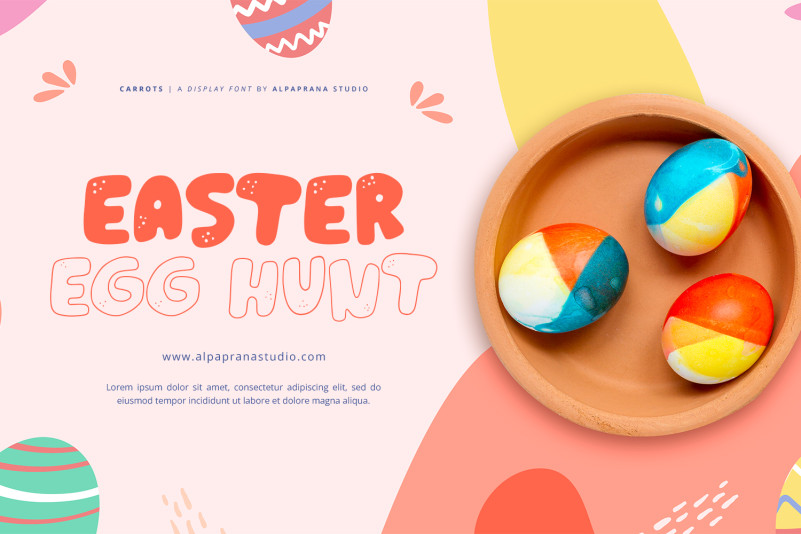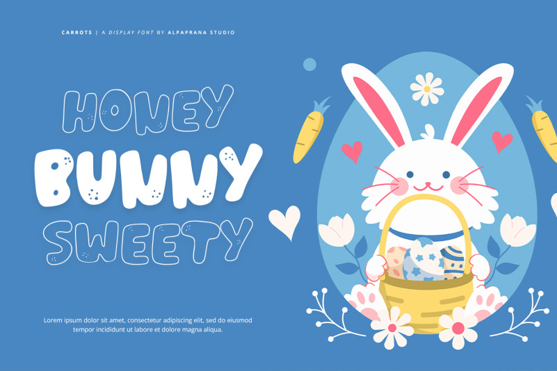 Carrots Display Font is a display font with cute and playful feels. It will be perfectly used for Branding, Logo Design, Lettering, Logotype, Clothing, Poster, magazine, packaging, posters, shopping bags, t-shirts, book covers, photography, special events and other design project.