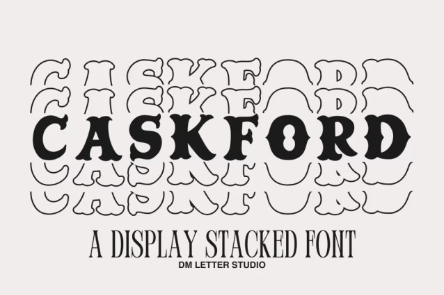 Caskford Stacked Font is a vintage old western font built with a layered style that brings immediate impact to headlines and badges. Inspired by classic saloon signs and frontier typography, it delivers bold character with a dimensional, poster-ready look. Because the structure stays clean and balanced, it reads clearly at both small and large sizes. Use it for logos, badges, posters, labels, signage, apparel, and rustic branding. As a result, your designs feel strong, confident, and unmistakably Western.