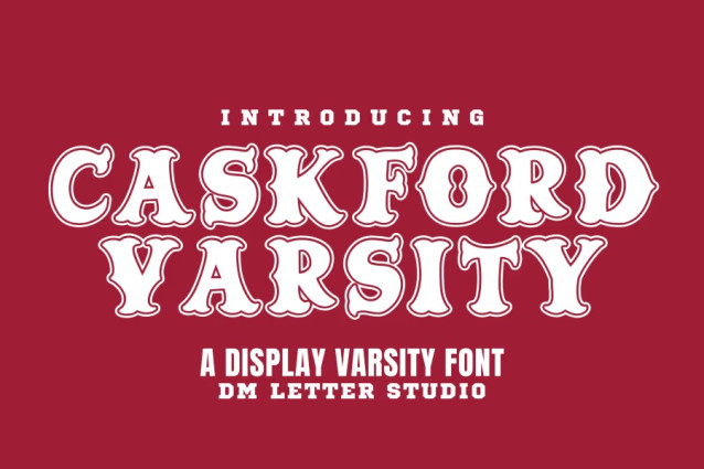 Caskford Varsity Font blends classic old western character with bold varsity letterforms to create a strong, confident display font. It carries the rugged spirit of frontier signage while adding the solid structure and weight you expect from collegiate typography. The shapes are bold and balanced, so text stays readable at any size. Use it for logos, apparel, team merch, posters, labels, signage, and vintage-inspired branding. As a result, your designs feel powerful, nostalgic, and built to stand out.