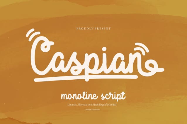 Caspian Monoline Font, from Denustudios, suitable for any projects such as: logos, branding projects, homeware designs, product packaging, mugs, quotes, posters, shopping bags, t-shirts, book covers, name card, invitation cards, greeting cards, label, photography, watermark, special events, and all your other lovely projects that need a Monoline Script taste.