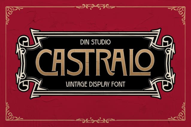 Castralo Vintage Font a striking display font that blends vintage style with a modern edge. Crafted in all uppercase letters, Castralo shows a balanced weight that’s not too thick, making it perfect for designs that need a bold yet refined touch. The font’s sturdy and consistent sizing give it a solid and reliable feel, while maintaining excellent readability. As extra. Castralo gives ornaments.