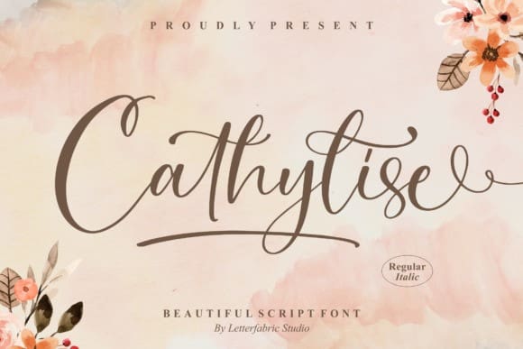 Cathylise Script Font – Beautiful Script Font, from Letterfabric Studio, is suitable for any projects such as logos, branding projects, homeware designs, product packaging, mugs, quotes, posters, shopping bags, t-shirts, book covers, name cards, invitation cards, greeting cards, label, photography, watermark, special events, and all your other lovely projects that need a beautiful script taste.