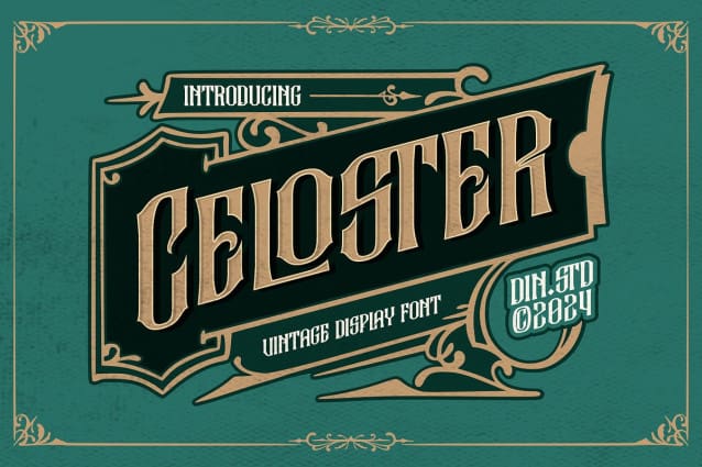 Celoster Vintage Font – a bold, all-caps font designed to make a statement. With its thick, uniform proportions, this font commands attention while maintaining a sense of balance and cohesion. The distinctive outline, which features subtle curves and angles rather than rigid straight lines, adds a unique and creative flair to the design. Celoster Vintage is your go-to choice when you need to deliver a powerful visual message with style. As an extra, this font gives ornaments.