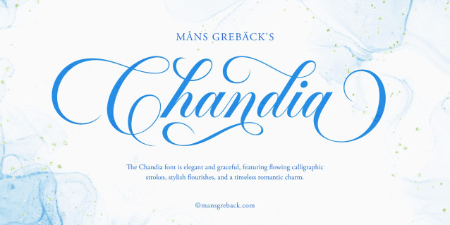 Chandia Script Font is a dramatic cursive typeface, drawn with high precision and an elegant hand.Flourishing with romantic swashes and long tails, the lettering flows with a confident grace that brings to mind engraved invitations, ballroom dances, and handwritten vows. The uppercase characters are especially expressive, designed with ornamental loops that accentuate the rhythm of the script without losing clarity.