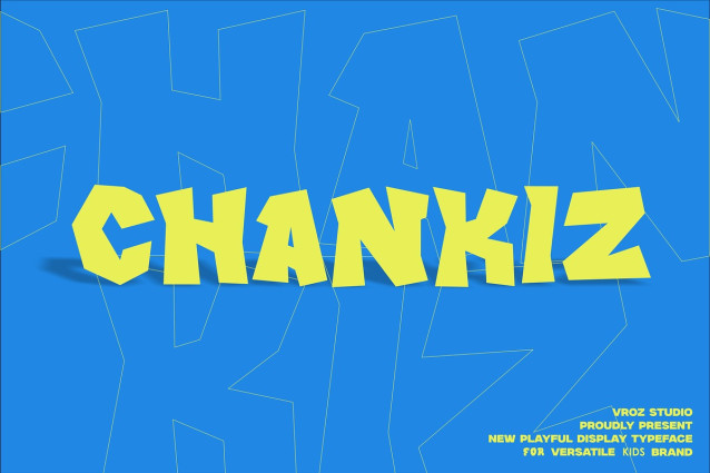 With its thick, brick-like letters and lively style, CHANKIZ is perfect for children’s books, cartoons, toy packaging, school projects, posters, games, YouTube thumbnails, and anything that needs a fun and bold touch.