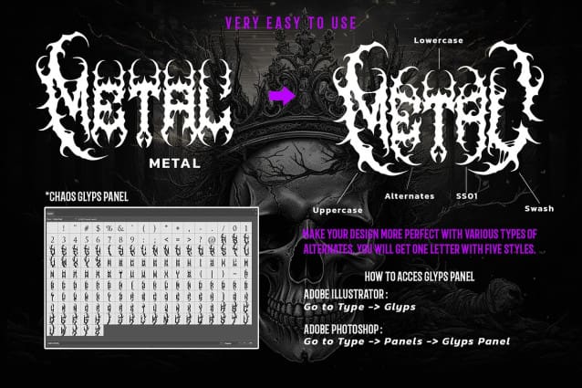 Chaos Black Metal Font, our brutal and intense font that’s perfect for capturing the ferocity of death metal. Chaos’ unique style will help your designs stand out from the crowd, with its bold shapes and distinctive appearance. Whether you’re creating album covers, merchandise, or promoting a death metal concert, Chaos will give your designs a memorable look that captures the essence of death metal music.