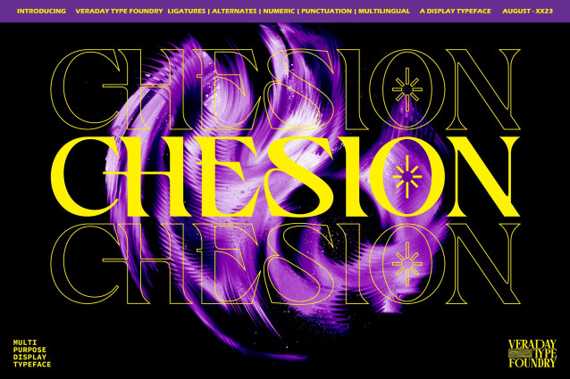 Chesion Display Serif is the part of a strong and modern Bold display. This typeface both impressive at display sizes and easily readable in text size, while the sharp shapes of the triangular serif and the distinctive letter shapes show their strength in logo design and impressive editorial use.